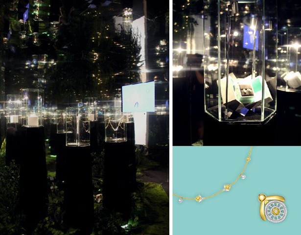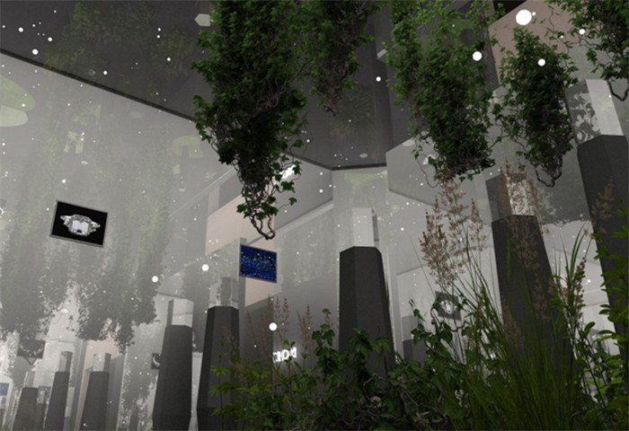 而在展区内模拟夏日丛林场景,通过定制全息投影、丛林主题香氛的加入,可以让观摩者如临其境,体验童年时期记忆中关于萤火虫的美好记忆。静谧的仲夏夜,树丛的疏影斑驳地倒映到墙上,草丛间、溪流边,一个个发光的小精灵在起舞。以模拟萤火虫不同生存形态的系列珠宝先后出现,让观看者体验一次有关美与自然的感官盛宴。