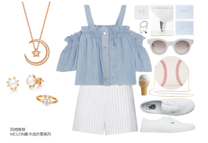 今年夏日最流行单品要属露肩装,露出美好锁骨线条,但是大面积露肤有些无聊?简约金色珠宝最百搭,众多时尚ICON都戴它出街。MCLON曼卡龙许愿系列,设计师以星空和罗马许愿池为灵感,K金材质打造灵动造型,小颗粒淡水珍珠引用,为整个系列增加一份柔美风情。
