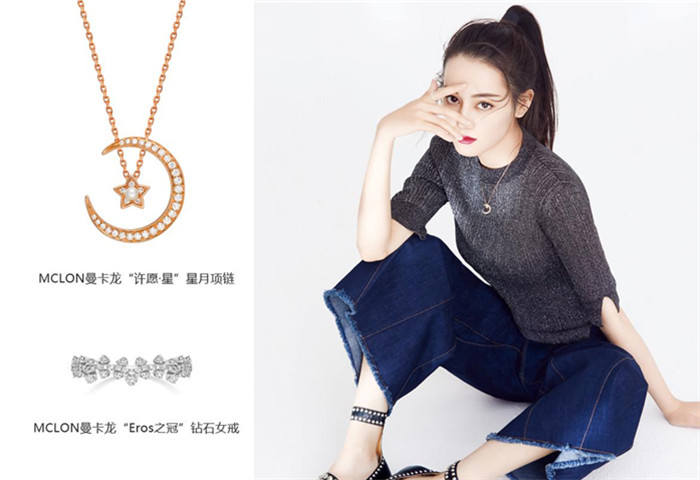 迪丽热巴身着气质深灰毛衣,搭配丹宁色牛仔裤,颈间MCLON曼卡龙珠宝“许愿·星”星月项链点缀,扎起高马尾,略显慵懒的pose散发率真女神的气质。
