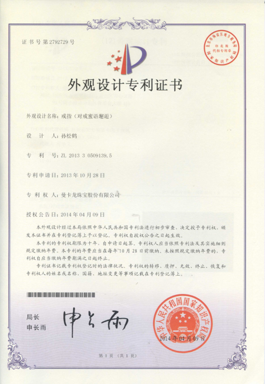 MCLON曼卡龙珠宝股份有限公司(以下简称“本公司”)为“曼卡龙”、“MCLON”、“今古传奇”等商标所有权人,及“许愿池”戒指、“醉美”钻戒、“假日”手镯、对戒“邂逅”等外观设计专利权人。